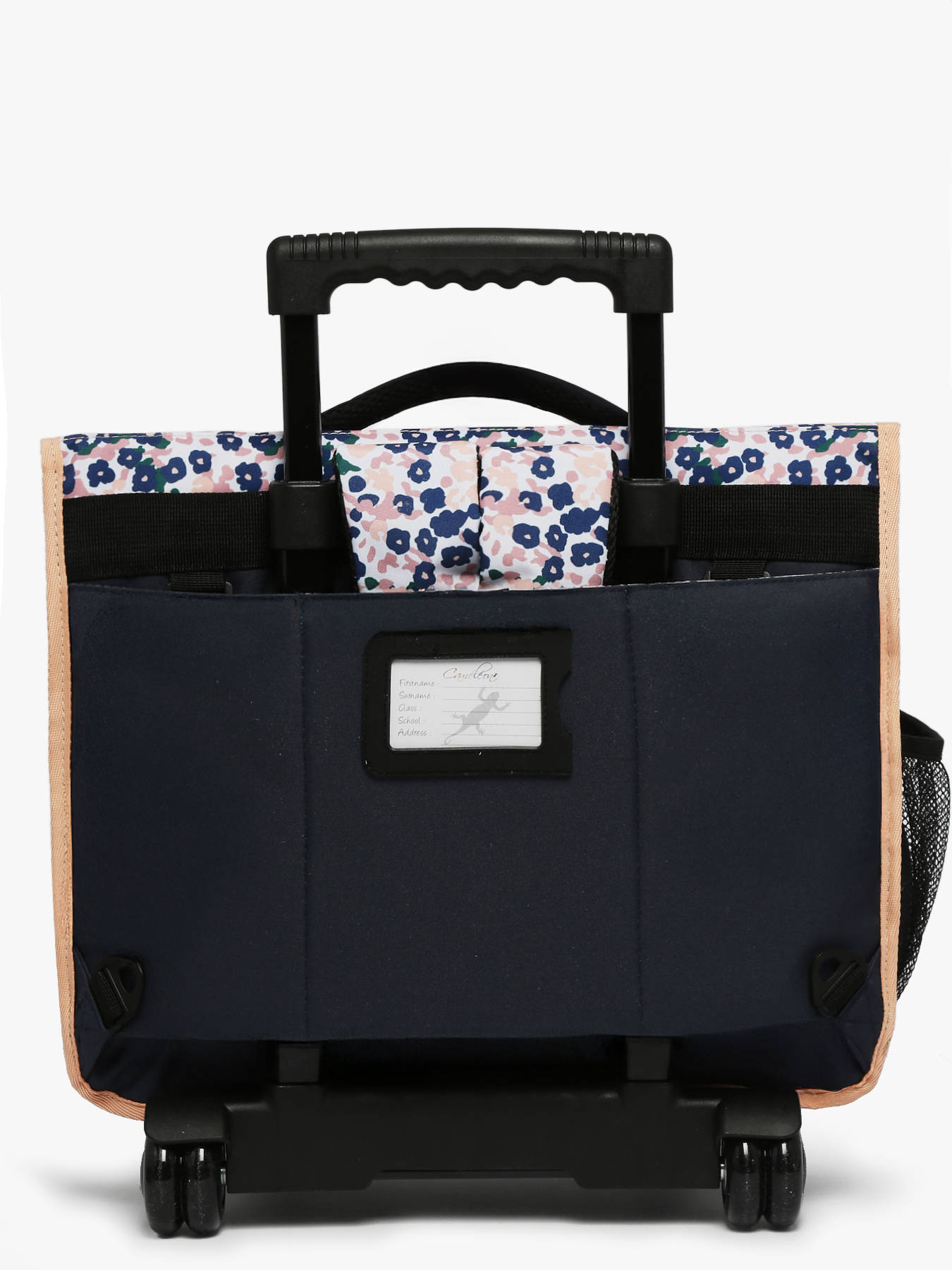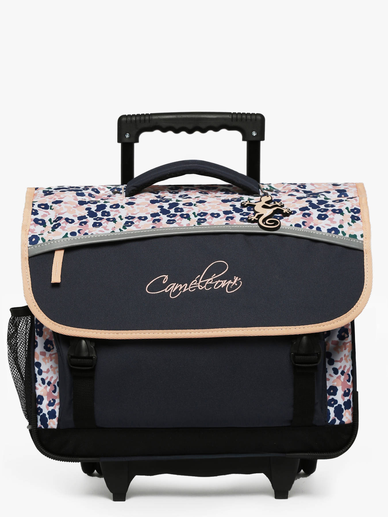 41 cm - 22 litres - 2.6 kg ~ Cartable enfant à roulettes 41 cm de la ligne Actual signé Caméléon. Ce cartable enfant convient parfaitement pour les classes de CM1 et de CM2. L'intérieur se divise en trois compartiments pouvant contenir toutes les affaires scolaires : cahiers formats 21x29,7 cm, 24x32 cm, classeurs A4 et classeurs A4 comptabilité. Il comprend une grande poche zippée intérieure et deux poches extérieures à fermeture éclair, très pratiques pour ranger les petits effets comme l’agenda ou le goûter. Un emplacement est prévu sur le côté pour y glisser une gourde. Ce cartable enfant à roulettes est fabriqué en polyester recyclé imperméable, résistant à l’eau pour un usage quotidien par tous les temps. Pour le faire rouler, il suffit de ranger les bretelles dans la poche au dos. Lorsqu’il est porté sur le dos, une protection rembourrée empêche le contact direct avec l’armature des roues, assurant un confort optimal. Le dos et les bretelles sont rembourrés, et le fond est renforcé pour une meilleure durabilité. Enfin, pour garantir une sécurité renforcée, des bandes réfléchissantes sont disposées tout autour du cartable. Petit plus : une étiquette pour le nom est présente au dos et une règle est offerte !