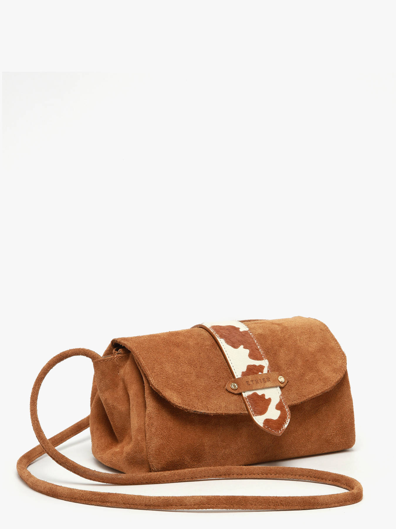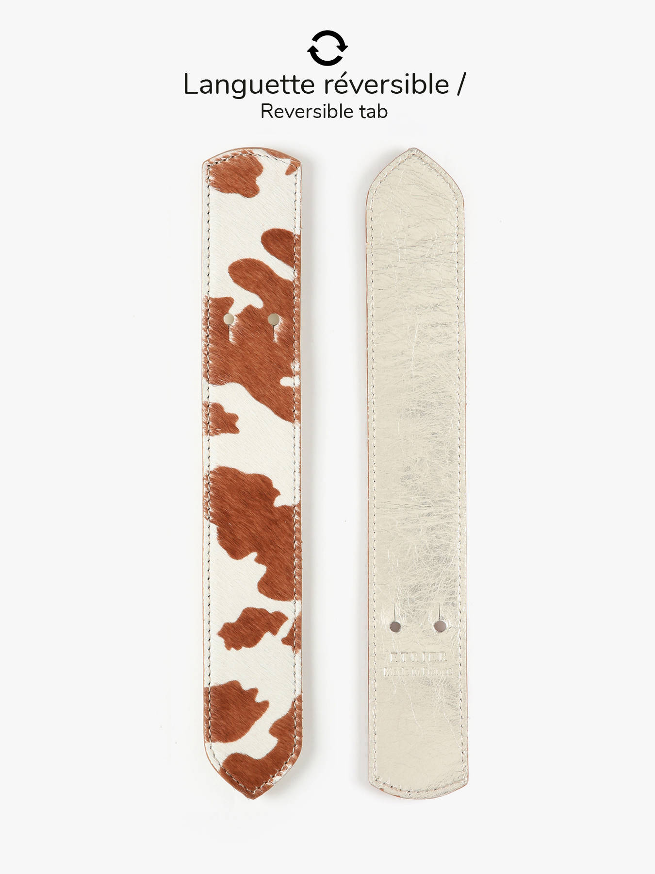 Personnalisez votre sac Agnès avec élégance grâce à la languette fantaisie ETRIER. Réversible et fabriquée en France, elle se distingue par son embossage signature ETRIER. Elle offre un côté en poil imprimé animalier et un côté en cuir doré, pour varier les styles selon vos envies. Disponible en quatre motifs tendance (vache, guépard, léopard et zèbre), elle apporte une touche originale et unique à votre sac tout en affirmant votre personnalité.